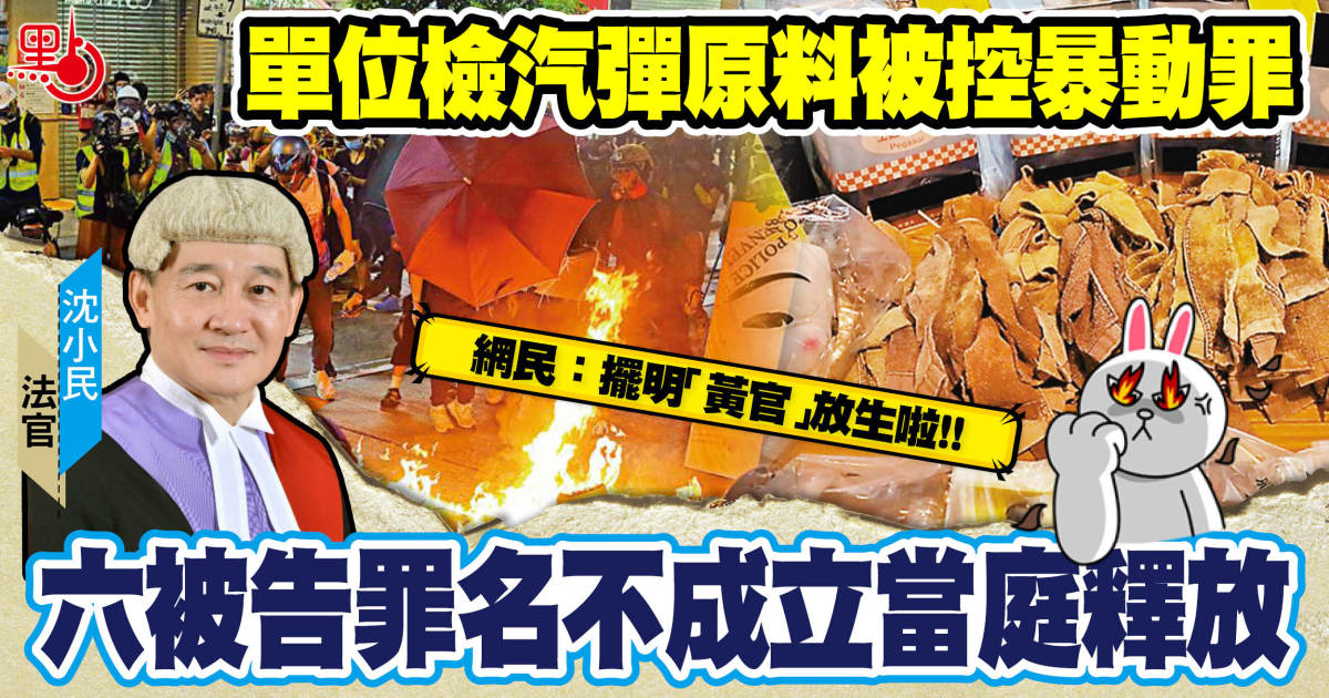 2019年10月1日警方於灣仔一個單位搜出白電油、布條、防毒面具及玻璃樽等物品,先後拘捕六名男女,被控串謀暴動罪及一項串謀參與非法集結成為交替控罪,案件於2020年11 月開審前,控方突改控串謀暴動罪。昨日(19日)法官沈小民最終裁定6名被告串謀暴動罪不成立,交替的串謀參與非法集結罪亦不成立,當庭釋放。