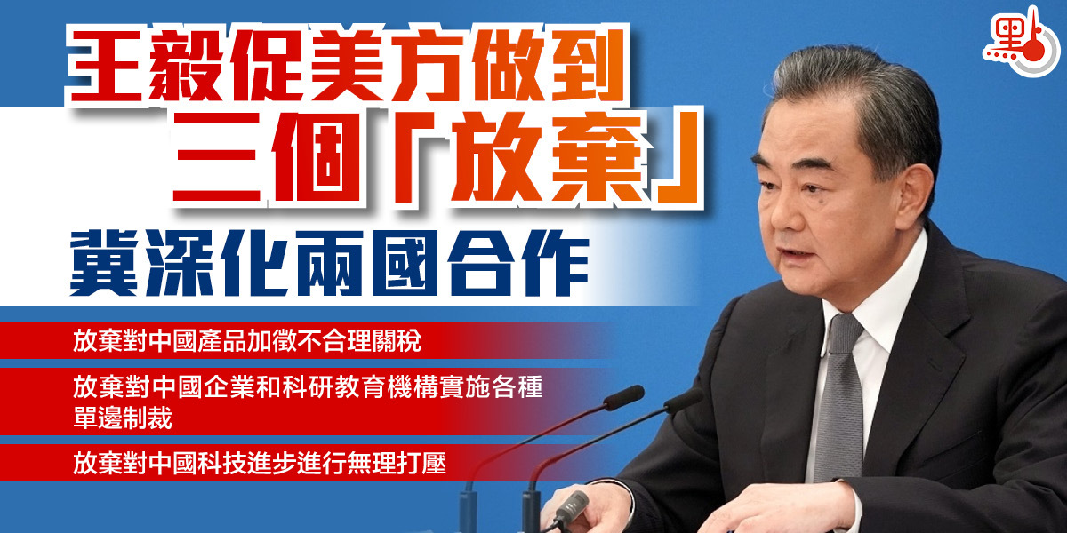 王毅表示,中國樂見美在華企業獲得更大成功,將繼續採取有力措施改善中國營商環境,同時希望美方盡快調整政策,放棄對中國產品加徵不合理關稅,放棄對中國企業和科研教育機構實施各種單邊制裁,放棄對中國科技進步進行無理打壓,為兩國合作提供必要條件。抗擊新冠疫情、應對氣候變化、推動世界經濟復甦是眼下國際社會最緊迫的三大任務,作為負責任大國,中方願意在這三個領域同美國協調政策,加強合作,攜手為世界作出積極貢獻。