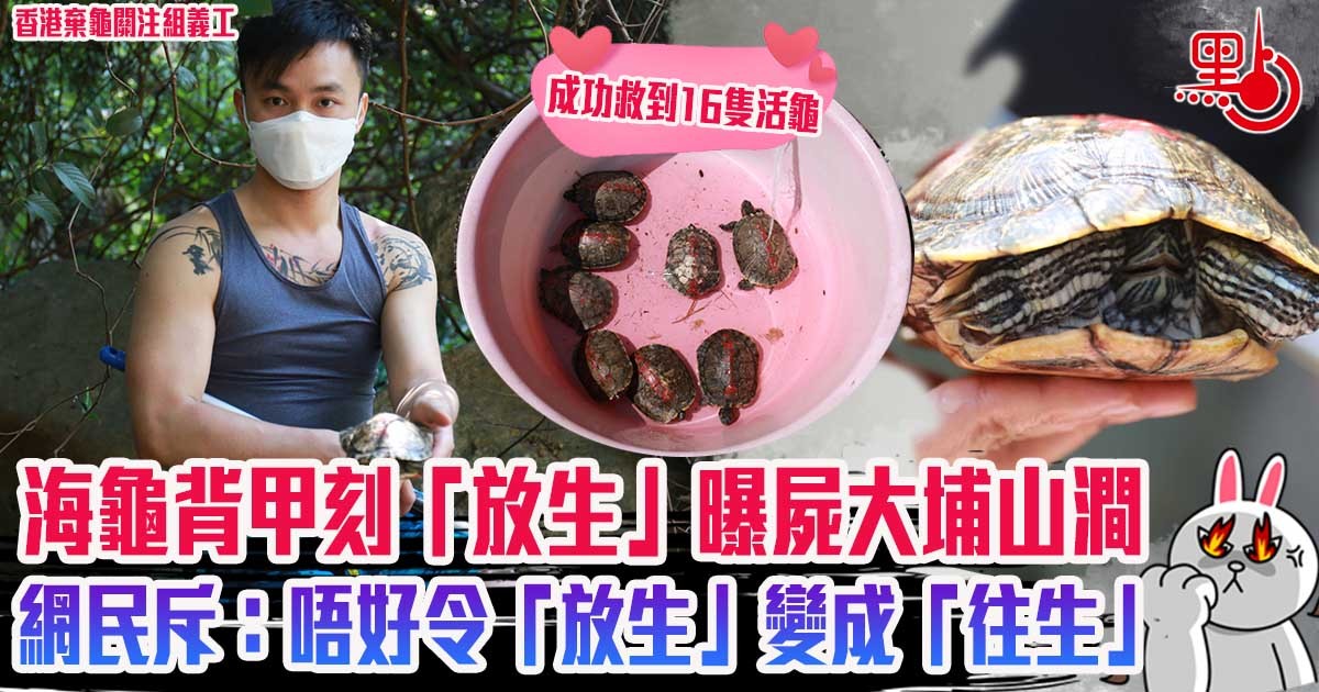 近年胡亂放生情況愈趨嚴重,甚至會將淡水生物放入大海,放生不成反變殺生。日前香港棄龜關注組收到市民反映,指大埔碗窰的一條山澗中,有至少20隻背部寫有紅字、疑為「放生龜」嘅巴西龜喺水中掙扎,因擔心佢哋未能適應野外環境無法生存。一班義工早前專程前往救龜,在三小時內,已成功救到16隻活龜。雖然如此,亦在河中撈到不少龜屍,因此希望再次呼籲市民停止放生行為。