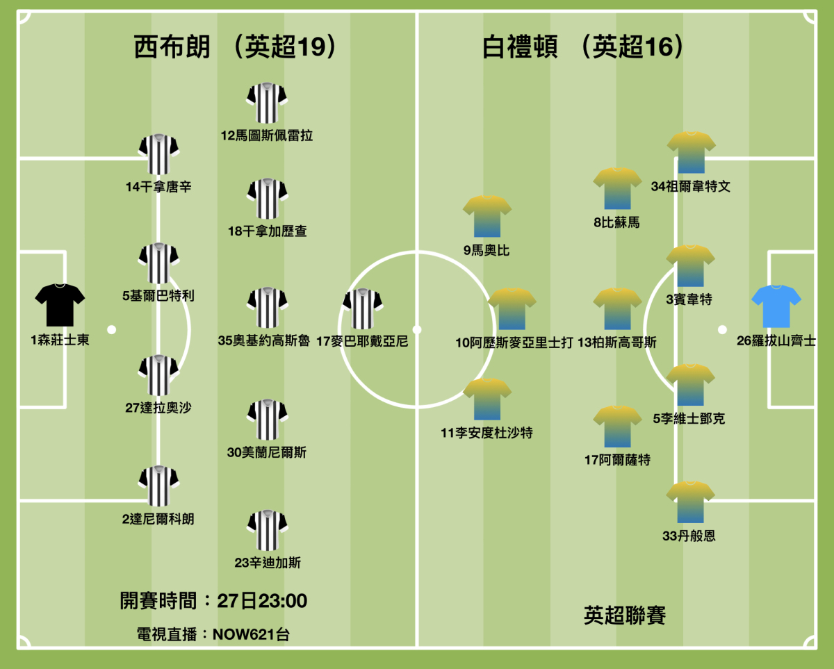 英超聯賽周末上演護級大戰。尾二的西布朗主場迎戰尾五的白禮頓,主隊與尾四的安全區域距離漸遠,若不爭取勝仗,隨時提早宣布玩完下屆降班英冠,奈何在易帥後走勢未見起色。白禮頓形勢稍佳,惟近況回落之下,兩隊「海軍鬥水兵」,或合演一場終極悶戰。(香港時間周六晚上11時開賽)(NOW621台直播)