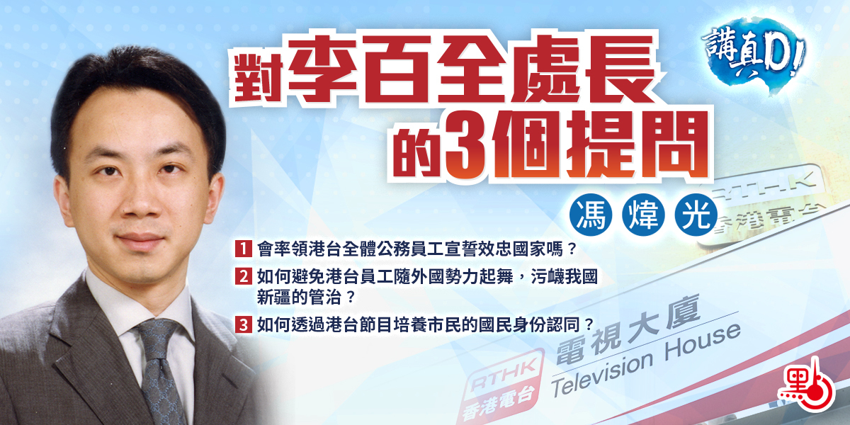 港台是輿論陣地,戰略位置重要。港台奉為圭臬的英國廣播公司BBC,該台的約章開宗名義是由英女皇伊莉莎伯二世頒布的,且對女皇有好幾句溢美之詞。我們不要求港台約章對我國中央政府有溢美之詞,但由李處長率領全體港台具公務員身分的員工,宣誓2個擁護和2個效忠,行嗎?即宣誓擁護中華人民共和國憲法和基本法,效忠中華人民共和國和香港特別行政區(注意:中間有個「和」字」),行嗎?