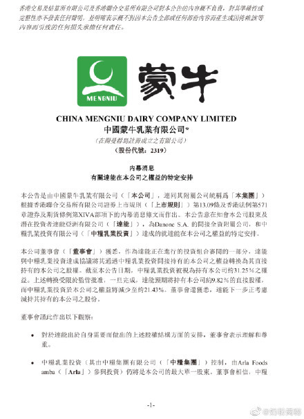 蒙牛乳業(02319.HK)今日(1日)表示,主要股東法國食品公司達能可能會減持。法國達能審閱投資組合後,與中糧乳業投資達成協議,將其通過中糧乳業投資間接持有蒙牛的權益,轉換為直接持有股權。或在今年較後時間出售有關投資,涉及約百分之9.8股權,套現所得用於回購自己的股份。
