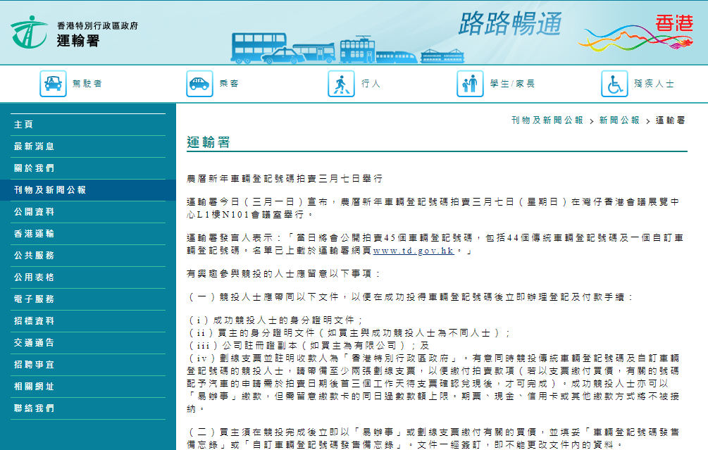 根據運輸署資料,當日將會公開拍賣45個車輛登記號碼,包括44個傳統車輛登記號碼及唯一自訂車輛登記號碼「W」,大部分不得轉讓。是次拍賣的車牌中,不少號碼包含諧音「發」的「8」,包括「SS888」、「PP6688」和「MR1818」等,顏文翰料無字母開頭的「330」、「96」、「63」亦會有大競爭;帶有「深圳發」「SZ 8」也會供競投,預計可能會受有內地背景的人青睞。