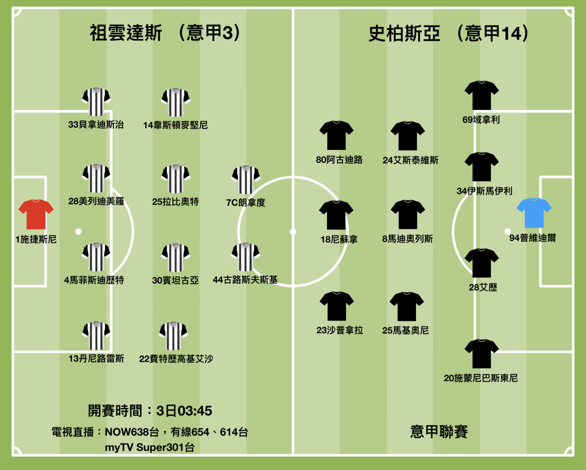 祖雲達斯在意甲落後聯賽榜榜首、多踢一場的國際米蘭10分,明天(3日)凌晨主場欣逢實力低兩班的史柏斯亞,弱隊亦要當作老虎來打,大勝沒有難度。(香港時間3日凌晨3時45分開賽,NOW638台,有線654、614台直播)