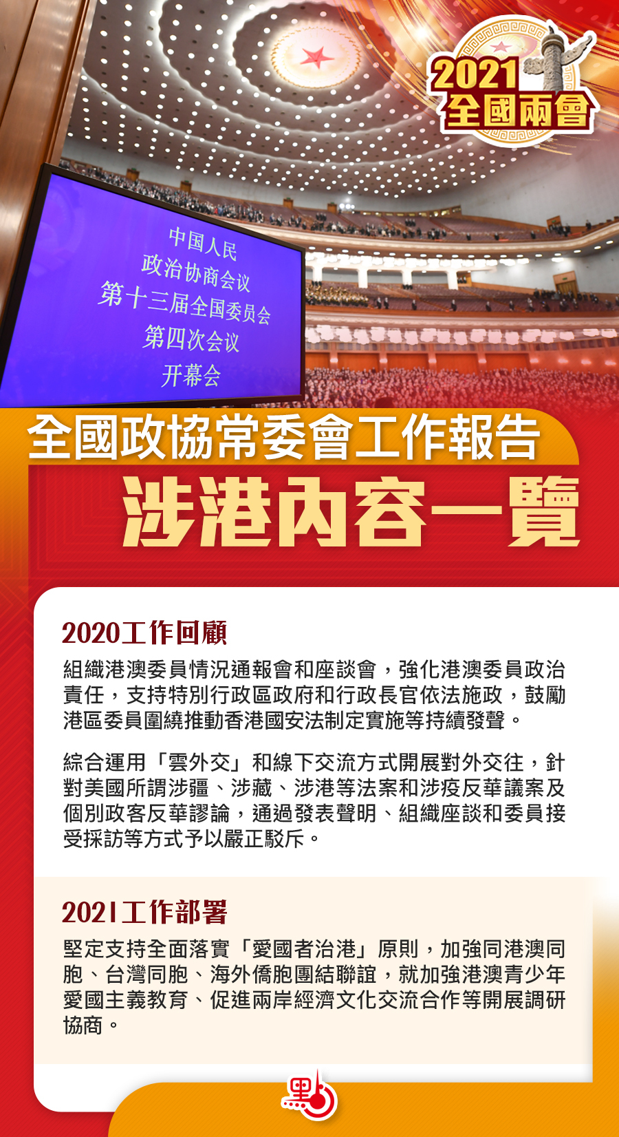 汪洋提到,過去一年,政協全國委員會及其常務委員會廣泛凝聚共識,匯聚團結合作正能量,組織港澳委員情況通報會和座談會,強化港澳委員政治責任,支持特別行政區政府和行政長官依法施政,鼓勵港區委員圍繞推動香港國安法制定實施等持續發聲。展望2021年,要堅定支持全面落實「愛國者治港」原則,加強同港澳同胞、台灣同胞、海外僑胞團結聯誼,就加強港澳青少年愛國主義教育、促進兩岸經濟文化交流合作等開展調研協商。