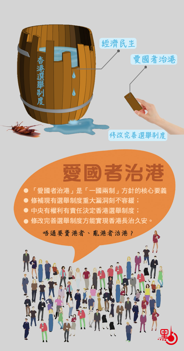 點解香港一定要實行「愛國者治港」呢? 因為「愛國者治港」係維護國家主權安全發展利益嘅必然要求,係「一國兩制」方針嘅核心要義,係民心所向!為咗落實「愛國者治港」,完善香港嘅選舉制度,堵塞選舉制度存在嘅漏洞同風險,更係刻不容緩!