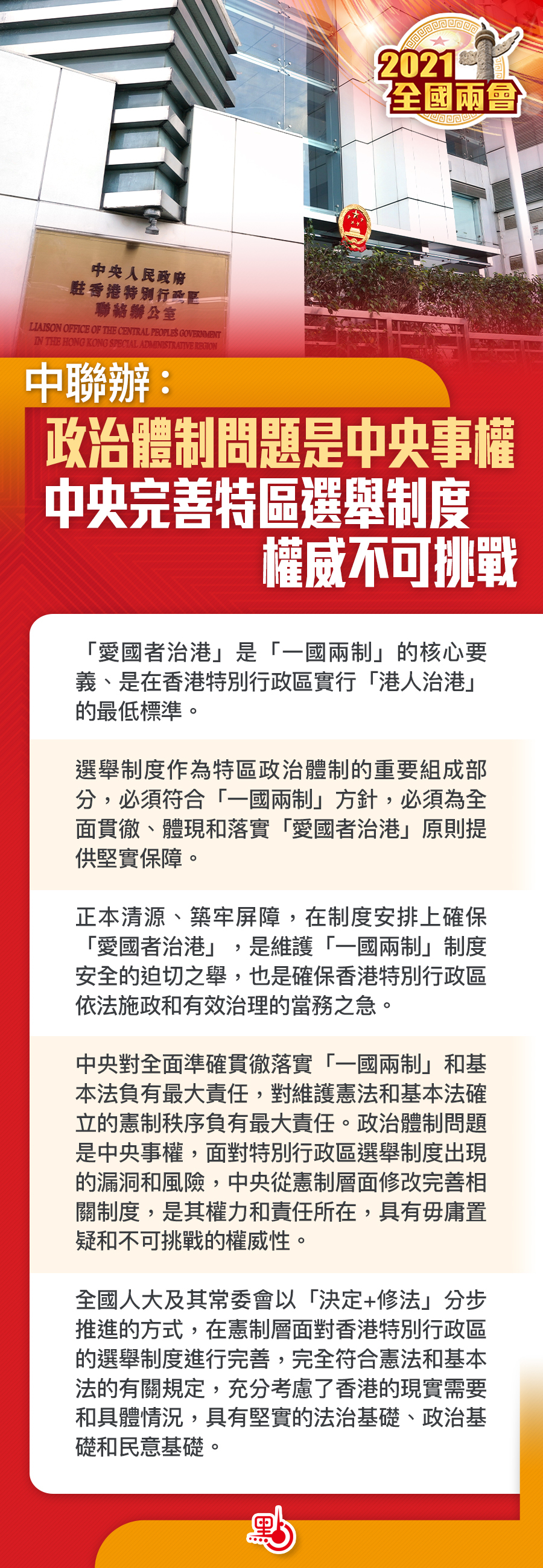 十三屆全國人大四次會議今日(5日)在京開幕,會議將審議《全國人民代表大會關於完善香港特別行政區選舉制度的決定(草案)》的議案。香港中聯辦發言人今日表示,中央對全面準確貫徹落實「一國兩制」和基本法負有最大責任,對維護憲法和基本法確立的憲制秩序負有最大責任。發言人強調,政治體制問題是中央事權,面對特別行政區選舉制度出現的漏洞和風險,中央從憲制層面修改完善相關制度,是其權力和責任所在,具有毋庸置疑和不可挑戰的權威性。