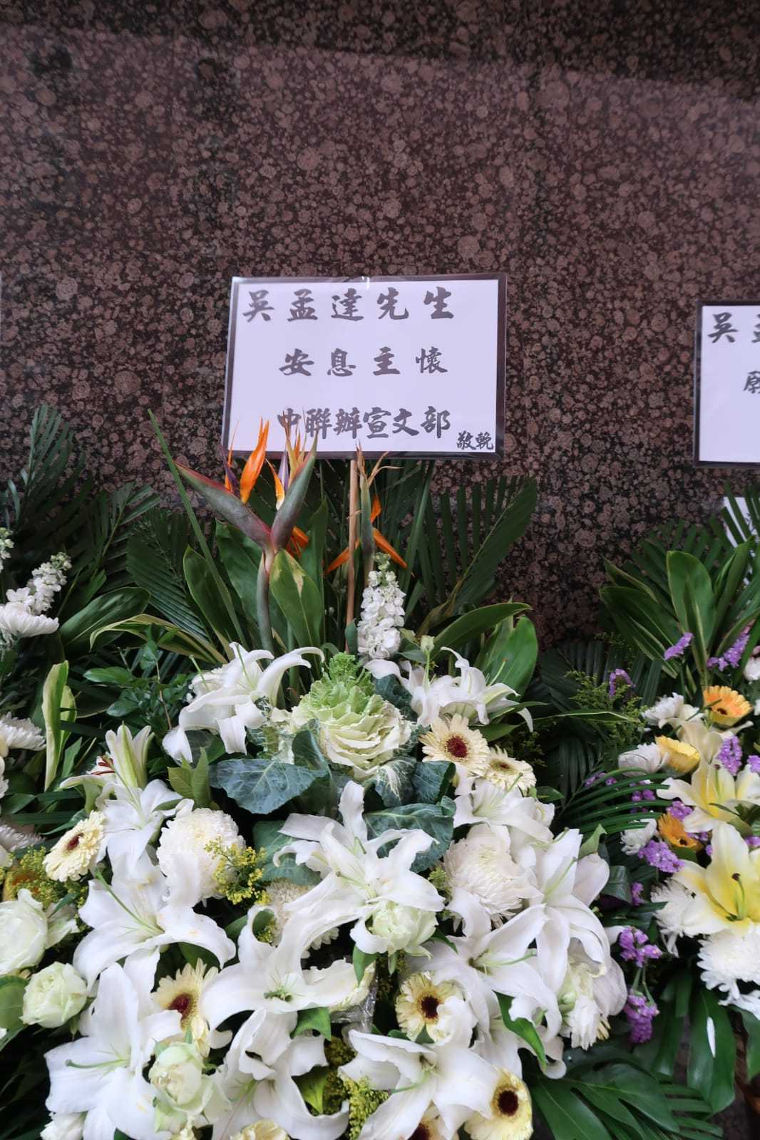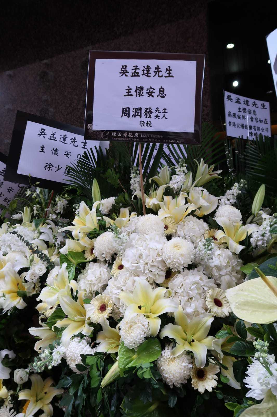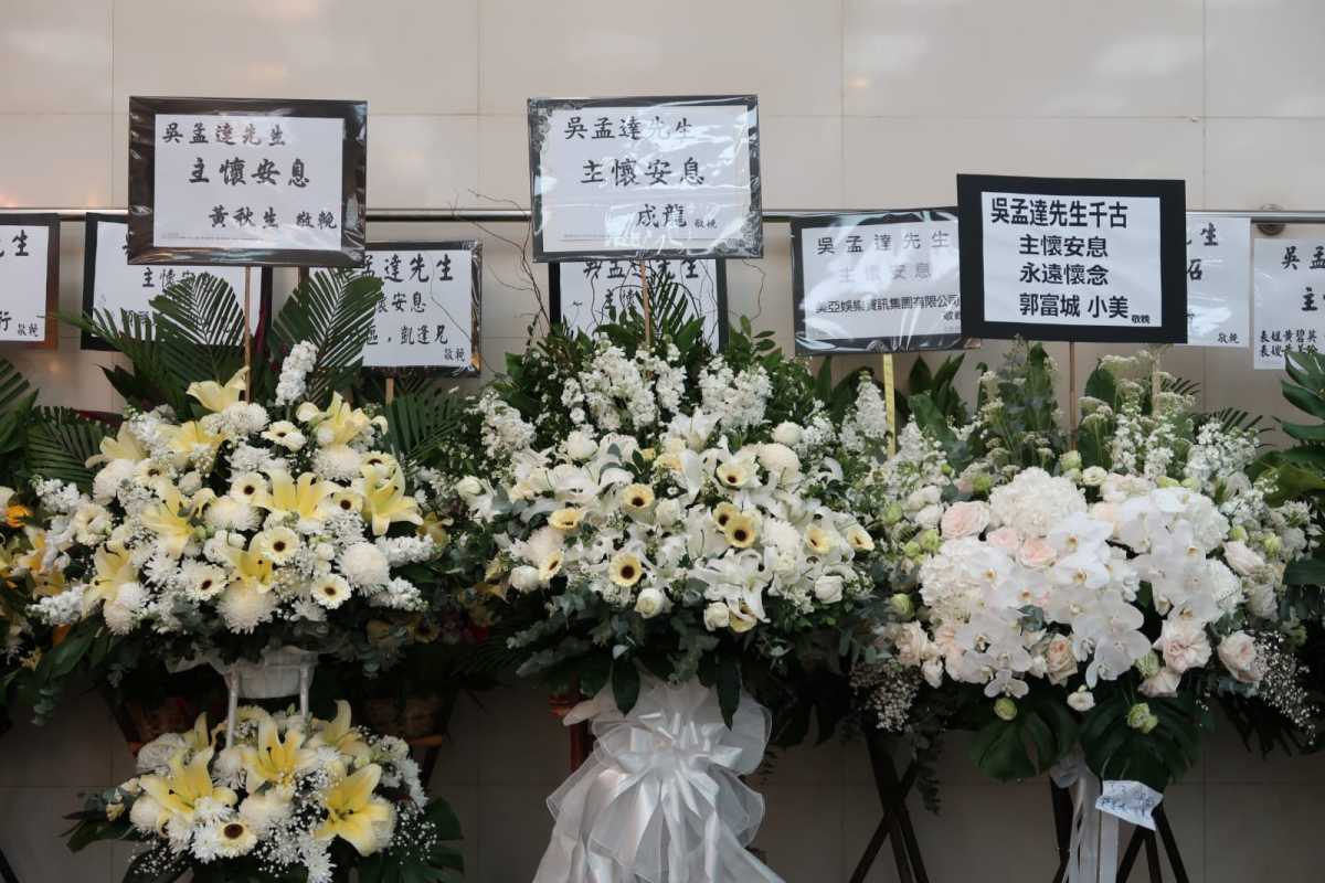 「黃金配角」吳孟達(達叔)上月27日因肝癌離世,今日(7日)在紅磡世界殯儀館地下景行堂設靈,進行基督教形式的喪禮。一眾圈中好友均送上花牌致祭,其中包括周星馳、周潤發、劉德華、成龍、黎明、郭富城、古天樂、劉青雲、楊千嬅夫婦、惠英紅等等。其中「星爺」周星馳的花牌放於家屬花牌旁的顯眼位置,備受重視。中聯辦宣文部亦有送上花牌致意。據悉,達叔明天(8日)火化後,骨灰將隨家人送到大馬,為他燦爛的影視生活寫上句號。