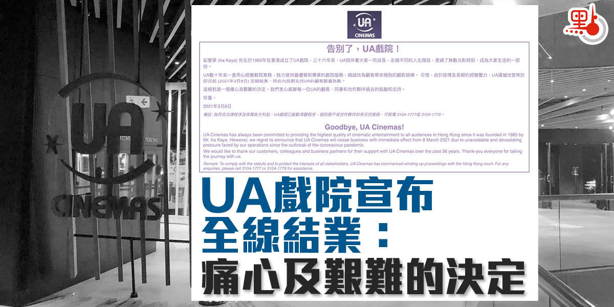 新冠肺炎持續一年多,基於「限聚令」戲院三度停業,最近一次戲院停業多個月至2月18日才重開,然而UA院線官方網站周日(7日)晚上開始沒有更新,至凌晨其官網已無法登入;UA Cinemas 應用程式亦無法使用。至今早(8日)UA戲院在官網向影迷道別,指受疫情衝擊及經營壓力,「遺憾地宣布於即日起全線結業」,結束在港36年的業務,形容「這絕對是一個痛心及艱難的決定」,並向長期支持的顧客致歉,感謝每位顧客、同事和合作夥伴過去的鼓勵和支持。戲院已啟動清盤程序。