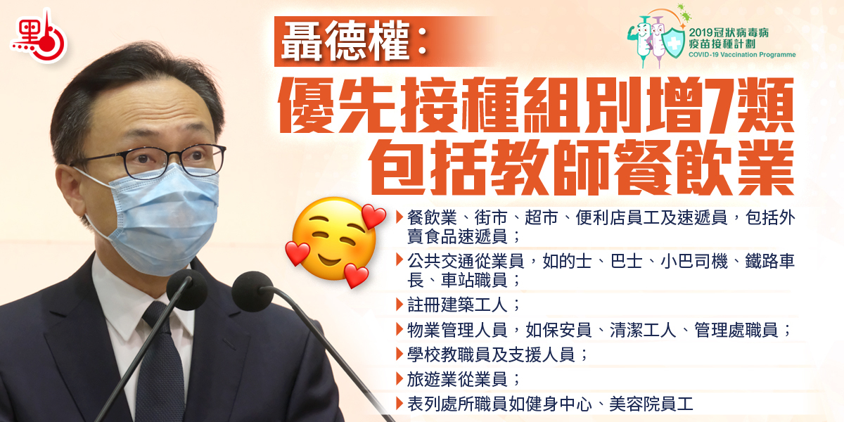 當局預計新增優先群組涉及130萬人,明日早上9時起可於網站預約,連同原本5類優先組別,共370萬人合資格預約接種。