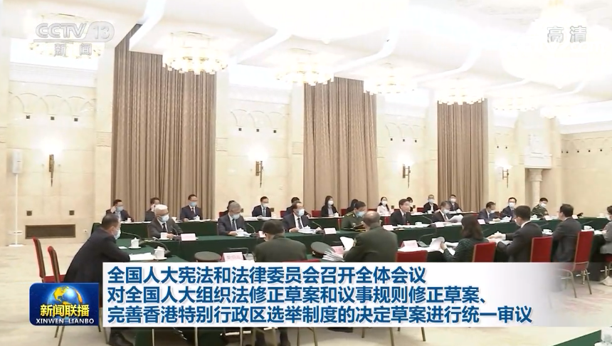 第十三屆全國人大憲法和法律委員會今晚(8日)召開全體會議,根據各代表團的審議意見,對全國人民代表大會組織法修正草案、全國人民代表大會議事規則修正草案、全國人民代表大會關於完善香港特別行政區選舉制度的決定草案進行統一審議。