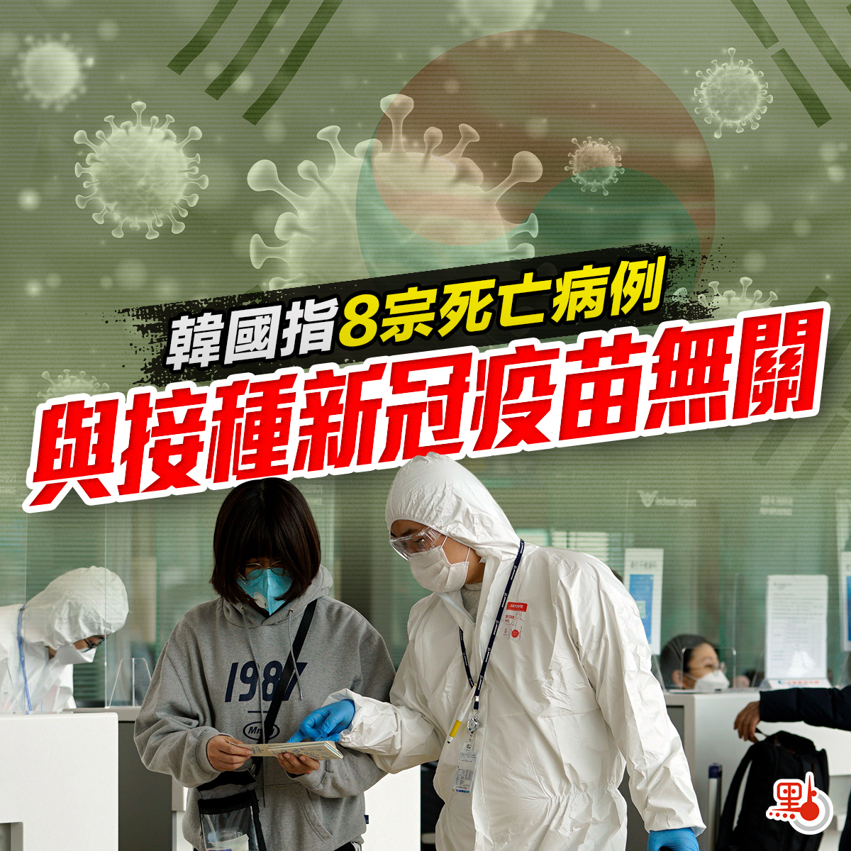 另外,韓國當局昨日(8日)表示,初步判斷接種新冠疫苗後死亡的11宗死亡病例中,有8宗與接種不存在直接因果關係,其餘3宗仍在研究中。據調查指,這8宗死亡病例都是療養院的患者,均患有長期疾病,年齡由20多歲至60多歲。據悉,他們都沒有出現嚴重過敏反應,因此當局推測,接種過程中疫苗出現問題的可能性不大。