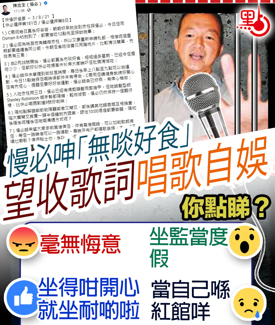47名攬炒政棍被控違反香港國安法中的「串謀顛覆國家政權罪」,大部分被告正還押候審。陳志全(慢必)的fb專頁小編日前發文透露,慢必最近由荔枝角收押所轉倉至赤柱監獄,要重新申請「私飯」,大呻「冇啖好食」,已瘦咗少少。慢必話希望市民多啲寫信畀佢,仲要加埋歌詞,等佢一路睇信可以一路唱歌喎。佢仲自爆晚上都有唱歌自娛,唱乜嘢歌?咪係黃絲藝人葉德嫻的《明星》囉。