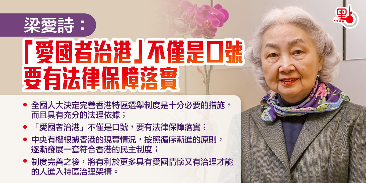 在北京召開的十三屆全國人大四次會議將就完善香港特區選舉制度作出決定。前律政司司長、基本法委員會前副主任梁愛詩9日接受新華社等媒體採訪時表示,全國人大決定完善香港特區選舉制度是十分必要的措施,而且具有充分的法理依據,完全符合憲法和香港基本法相關規定,有利於消除社會亂像,恢復香港繁榮穩定。她還說,「愛國者治港」不僅是口號,要有法律保障落實,選舉制度完善之後,香港會迎來更光明的前景。