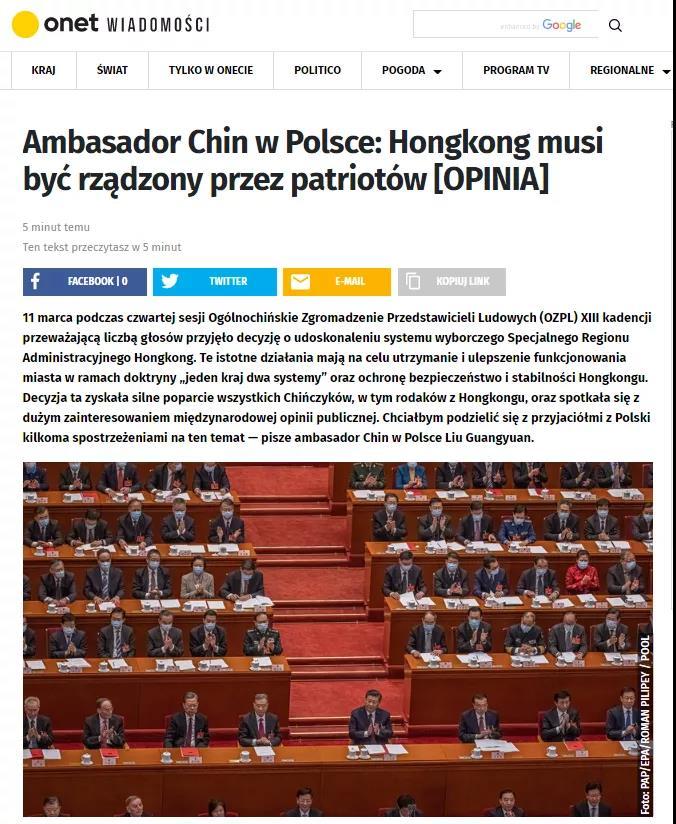 中國第十三屆全國人民代表大會第四次會議本月11日以高票表決通過關於完善香港特別行政區選舉制度的決定,這是中方堅持和完善「一國兩制」制度體系、維護香港長治久安的重大舉措,得到包括香港同胞在內全體中國人民的堅決擁護,也受到國際輿論的廣泛關注。我願就此向波蘭朋友分享幾點看法。