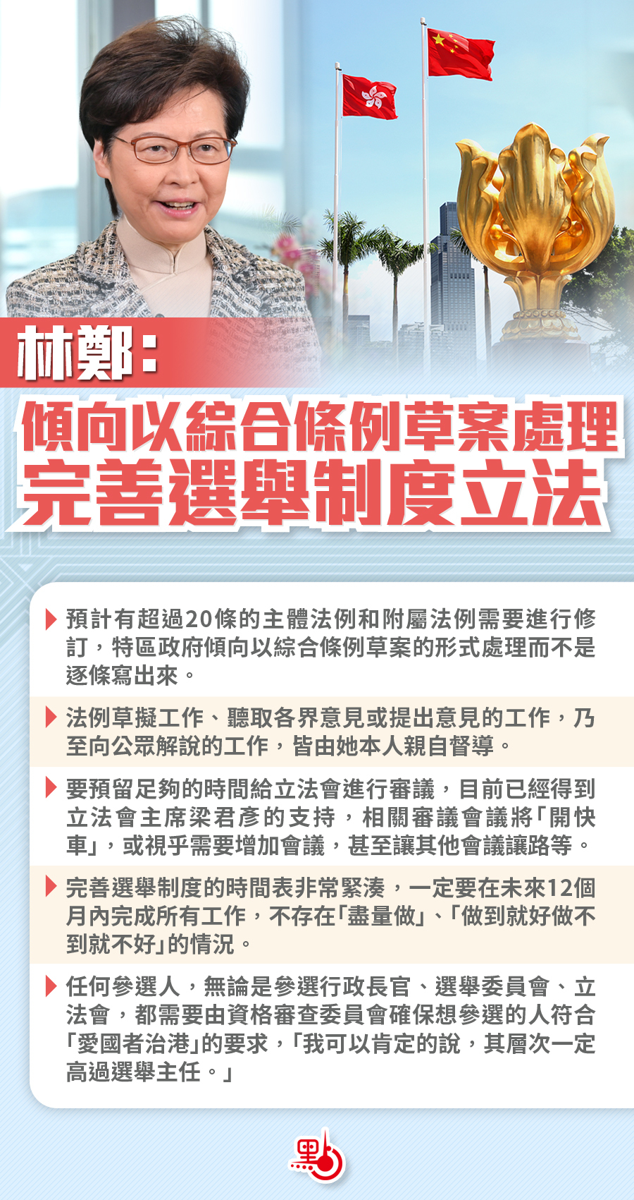 十三屆全國人大四次會議日前高票通過關於完善香港特別行政區選舉制度的決定,行政長官林鄭月娥近日接受《大公報》《文匯報》專訪時強調,特區政府一定要在未來12個月內完成本地立法工作及進行三場選舉,特區政府傾向以綜合條例草案的形式處理而不是逐條寫出來。林鄭月娥並表示完成本地立法事關重大,她本人將親力親為親自督導。