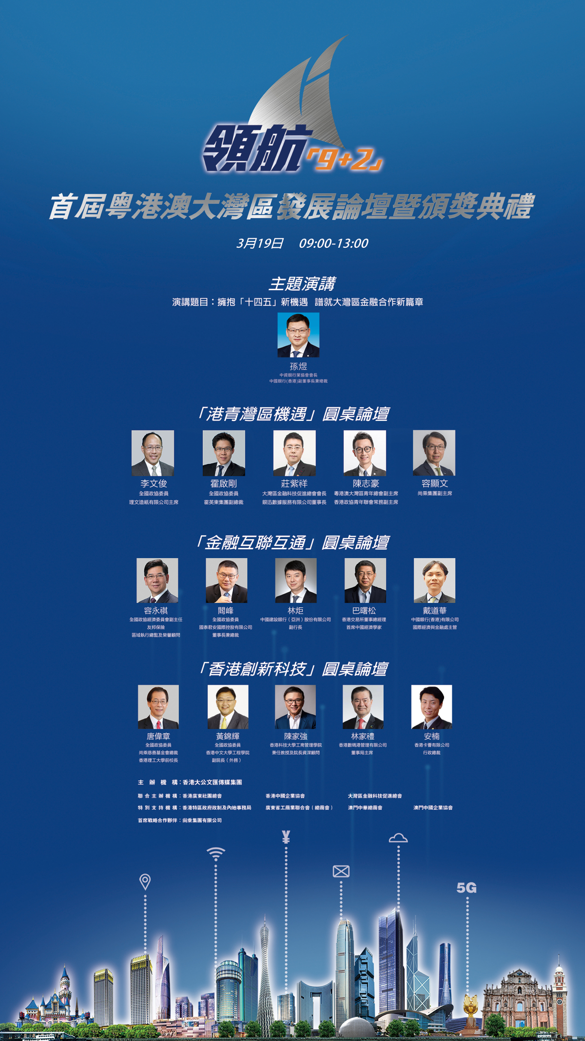 論壇邀請粵港澳政商界領袖、企業家、權威專家等共同參與,聚焦大灣區經濟發展成就與機遇,展望未來以及香港在大灣區建設發展的重要角色等,力圖打造各界互聯互通、共商共建大灣區的高層次對話平台。