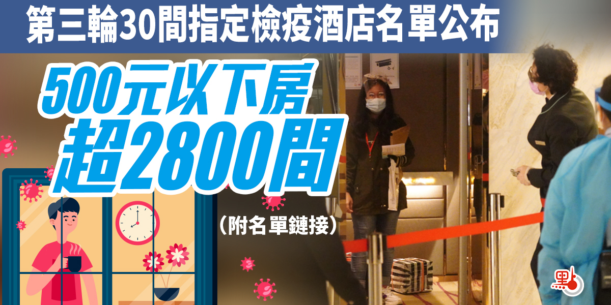 政府今日(19日)公布第三輪指定檢疫酒店的名單,新一輪酒店共30間,提供房間約8300間,合約期由4月21日起至6月19日。新一輪會提供較多房價較低的酒店,其中提供500元或以下房間的酒店由11間增至13間,房間數目共超過2800間,佔第三輪酒店提供房間總數的34%;1000元或以下的酒店房間佔約84%,共有約7000間房間。