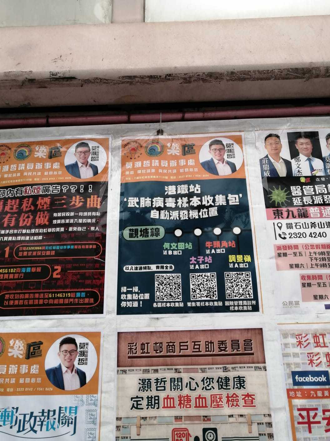 再有讀者報料,黃大仙攬炒派區議員莫灝哲在彩虹站附近的公眾地方張貼一張檢測樣本收集包資料的海報,其中海報全文稱新冠肺炎為「武漢肺炎」,而非用官方名稱「COVID-19」或「新冠肺炎」,被質疑以污名化名稱散播歧視思維。