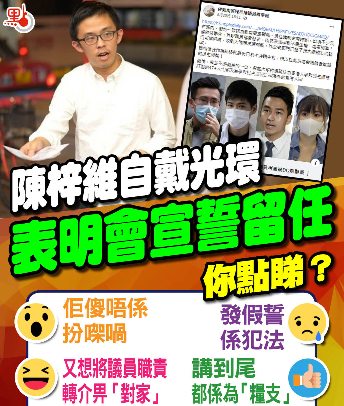 攬炒派油尖旺區議員陳梓維日前在fb出帖「自戴光環」,聲稱區內的街坊讚揚他不畏強權,處事認真,一致認同他應宣誓喎。陳梓維在帖文「自抬身價」,透露曾有公安部門約談他的內地親友,相信自己新移民身分已成「眼中釘」,故決定跟隨其他攬炒派議員宣誓。