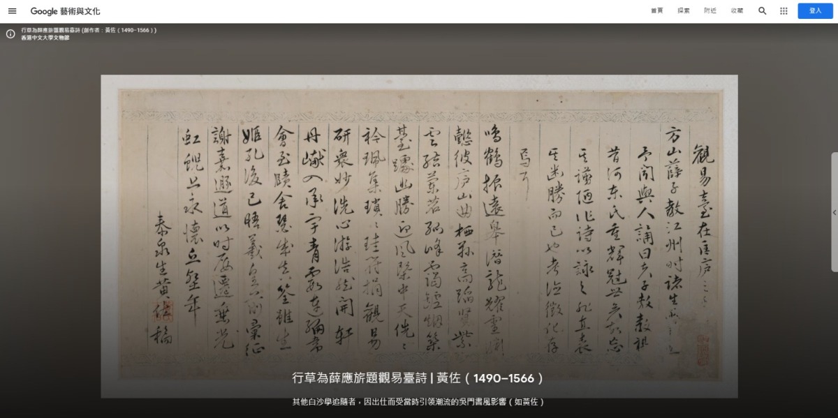 香港中文大學文物館和Google藝術與文化(Google Arts & Culture)合作,推出了中大文物館數碼展品及網上展覽,讓世界各地的文化藝術愛好者即使足不出戶,也能欣賞「辛丑說牛」、「廣納百川:明至清中期廣東書畫選」和「時光藝遊舊香港」三大展覽,以及270多件館藏品如繪畫、書法、陶瓷、碑帖及照片等。透過中大文物館與Google的網上平台,公眾能享用免費網上資源增進知識,隨時隨地細味高質圖像的藝術品。