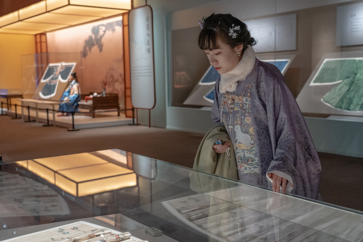 劉玉彬還是山東博物館的常客,經常去參觀學習,借鑑其中的傳統文化元素,尋找設計靈感。山東博物館近期推出了「衣冠大成——明代服飾文化展」,展出30餘件明代服飾文物,從禮儀文化、織繡技術等多角度重現了「大明風華」,讓喜愛明代漢服的劉玉彬欣喜若狂,幾乎每周末都要去看一看。觀展時,劉玉彬會穿着帶有復原文物圖案的服飾,觀看保存完好、色彩鮮艷的明代傳世成衣實物,彷彿同百年歷史隔空交流,這種感受令劉玉彬如痴如醉,流連忘返。