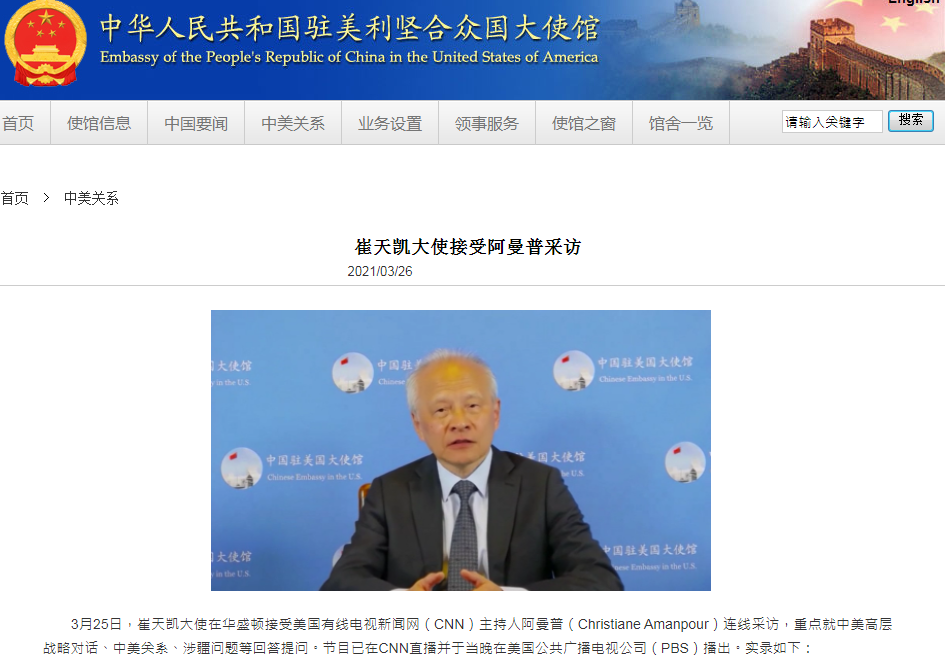 中國駐美國大使崔天凱當地時間25日接受美國有線電視新聞網(CNN)國際頻道的採訪。在觀看了CNN一則有關中國新疆的報道後,崔天凱當場指出,CNN這種偏離事實,控制輿論的報道和行為是「不真實的」、「不道德的」,他強烈譴責美國官方和媒體對於中國在新疆問題上的污蔑。