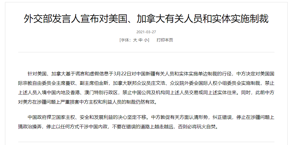 外交部今日(27日)表示,針對美國、加拿大基於謊言和虛假信息於3月22日對中國新疆有關人員和實體實施單邊制裁的行徑,中方決定對美國國際宗教自由委員會主席曼欽、副主席伯金斯,加拿大聯邦眾議員莊文浩、眾議院外委會國際人權小組委員會實施制裁,禁止上述人員入境中國內地及香港、澳門特別行政區,禁止中國公民及機構同上述人員交易或同上述實體往來。同時,此前中方對美方在涉疆問題上嚴重損害中方主權和利益人員的制裁仍然有效。