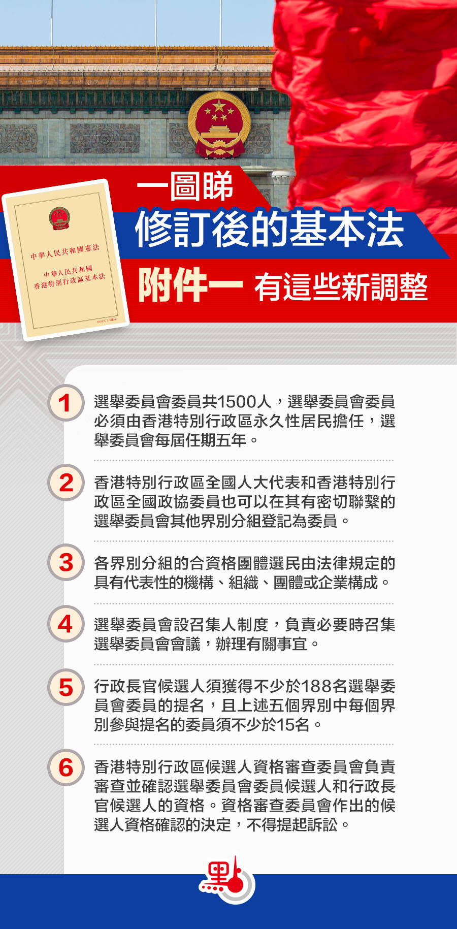 修訂後的基本法附件一全文今日(30日)公布,當中列明行政長官由一個具有廣泛代表性、符合香港特別行政區實際情況、體現社會整體利益的選舉委員會根據本法選出,由中央人民政府任命。選舉委員會委員共1500人,由五個界別人士組成。行政長官候選人須獲得不少於188名選舉委員會委員的提名,且上述五個界別中每個界別參與提名的委員須不少於15名。每名選委會委員只可提出一名候選人。基本法附件一還有哪些新修訂?快來睇下!