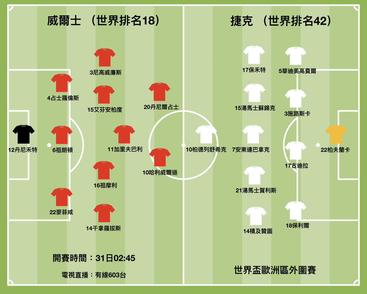 處身世盃外歐洲區E組的威爾士隊,在明日(31日)的分組賽,主場力爭在暫時領先積分榜的捷克腳下取得分數。威爾士隊在主力球員獲較多休息時間下,搶3分要有運氣,奪1分機會較大,今仗他們是處於坐和望贏格局。(有線603台31日凌晨2時45分直播)