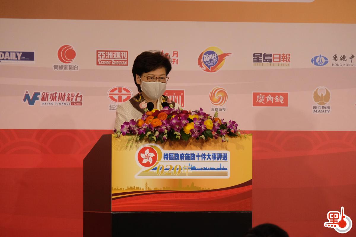由點新聞、大公報及香港文匯報等23家媒體聯合主辦的「特區政府施政十件大事評選」頒獎典禮今日(31日)下午在灣仔會展中心舉行。香港特區行政長官林鄭月娥,香港中聯辦副主任盧新寧,外交部駐港特派員公署副特派員潘雲東,全國政協委員、香港大公文匯傳媒集團董事長姜在忠等出席並擔任主禮嘉賓。
