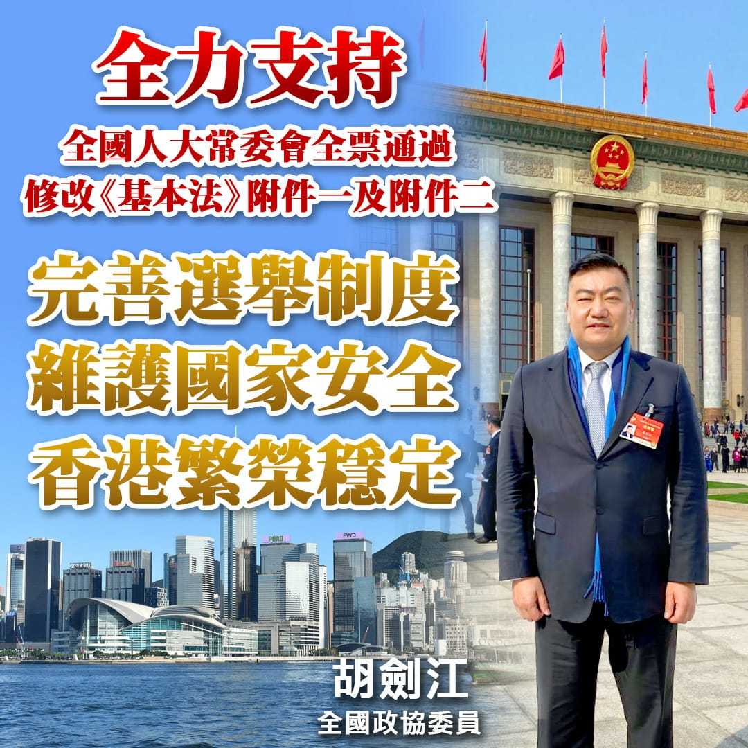 全國人大常委會3月30日經審議全票通過香港基本法附件一、附件二的修訂案,對特區行政長官的產生辦法和立法會的產生辦法與表決程序作出法定修改安排。港區全國政協委員胡劍江今日接受點新聞訪問時(3日)表示,堅決支持和堅定擁護人大常委會的決定,不僅為完善香港選舉制度提供了法治依據,從根本上堵塞了選舉制度漏洞,更為「愛國者治港」奠定堅實的制度保障,為「一國兩制」行穩致遠護航。