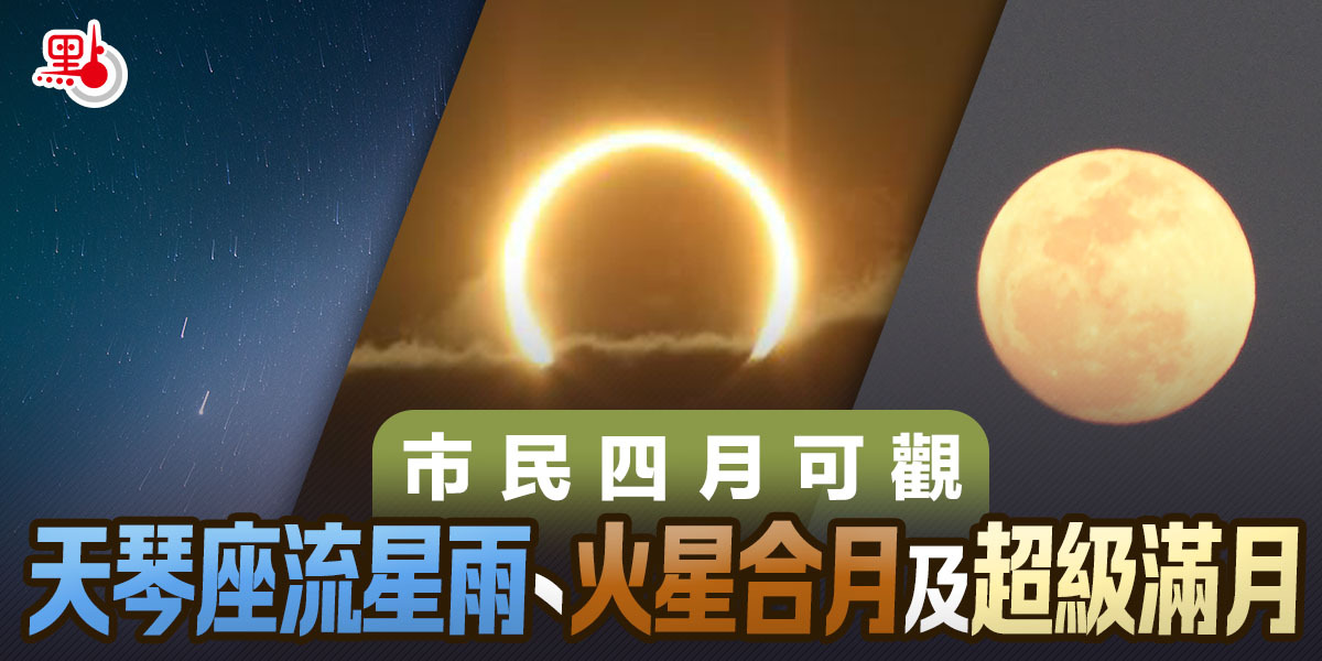 香港太空館網站顯示,本港今月可欣賞到「天琴座流星雨」、「火星合月」及「超級滿月」三大天象。以「火流星」著稱的「天琴座流星雨」活躍期為本月14日至30日,香港太空館建議觀測時間為22日(周四)晚上11時至23日早上5時,高峰期則是22日晚上9時許,預計屆時天頂每小時流星數目高達18顆。