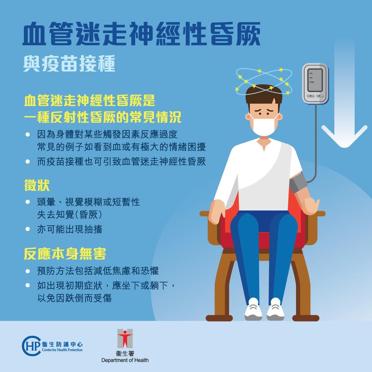 衞生防護中心今日(3日)呼籲市民在疫苗接種前後減低焦慮和恐懼,以免出現「血管迷走神經性昏厥」。疫苗接種可引致血管迷走神經性昏厥,患者會出現頭暈、視覺模糊或短暫性失去知覺。昏厥情況一般維持少於20秒,但亦可持續至數分鐘。