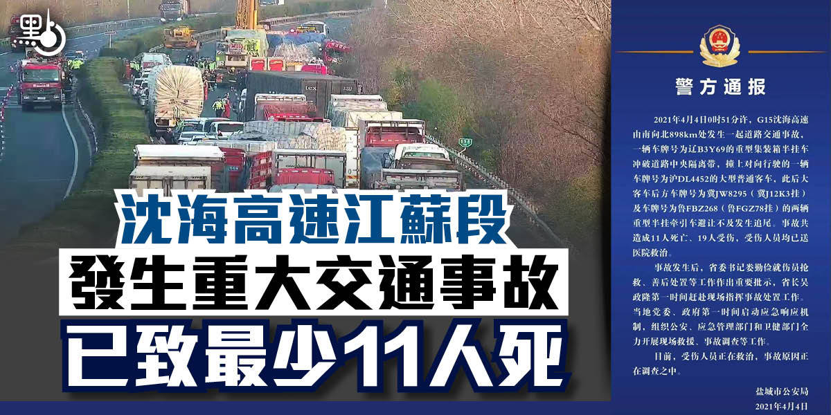 記者從江蘇省交通綜合執法局、鹽城市公安局等多個部門核實了解到,截至目前,事故已造成11人死亡,受傷人數仍有待統計。經現場人員初步核實:大客車(滬D-L4452)為上海市至江蘇省連雲港市灌雲縣的班線客車,車輛所屬公司為上海新大都客運有限公司,車輛相關資質證件合法有效。肇事貨車未超載,橫穿中央護欄原因尚有待調查。