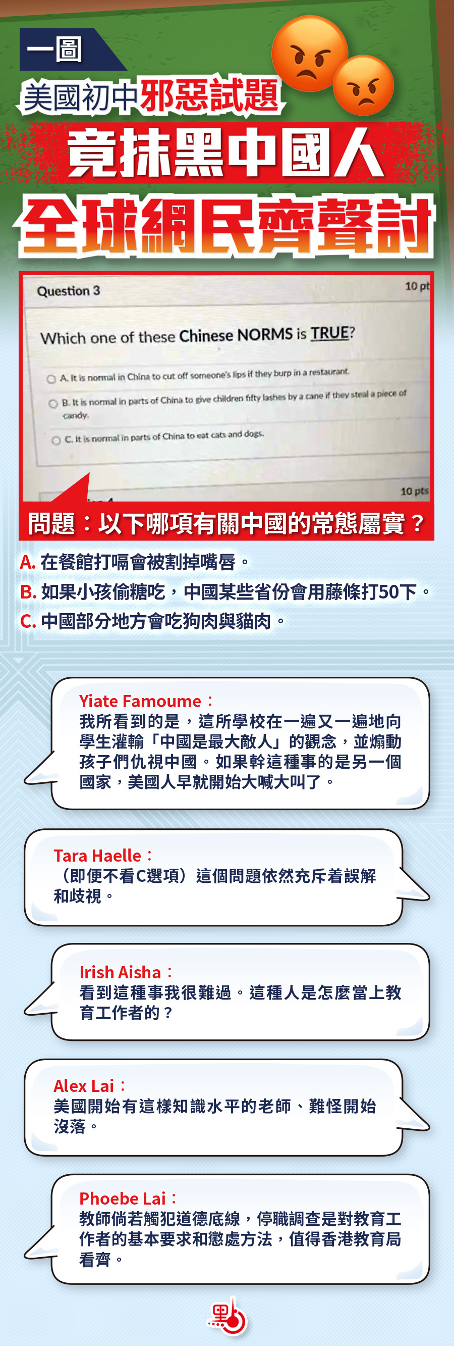 美國政府長期借所謂「人權」和涉港涉疆議題抹黑中國,更在自己國內大搞洗腦宣傳,無論教育、媒體抑或荷里活電影,都灌輸敵視中國人以至所有亞裔人的訊息。日前,美國得州有學校教師竟出試題問所謂「中國常態」,提供極荒謬的答案,包括「在餐館打嗝會被割掉嘴唇」、「小孩偷糖吃會被藤打50下」等洗腦言論。問題試卷在網上曝光,即時引起全球網民憤怒聲討。