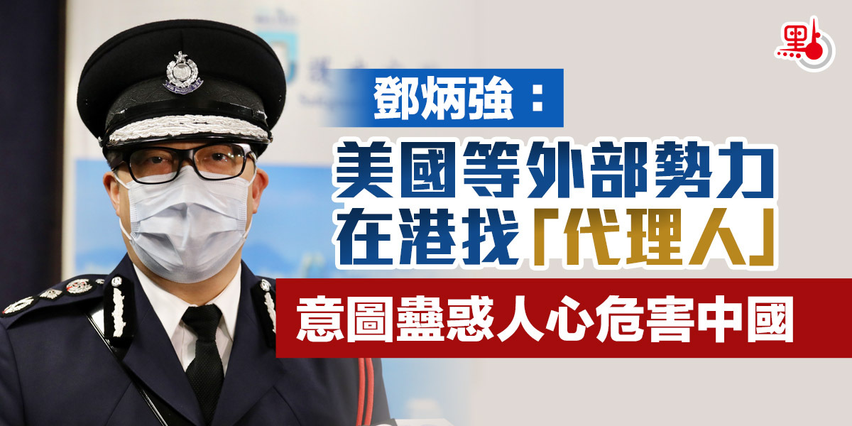鄧炳強又提到,有關媒體亦會利用民調或研究,或者訪問匿名人士,以引起爭端,進一步煽動年輕人進行違法及暴力行為。代理人又會攻擊警隊及政府,企圖癱瘓政府部門。他強調,任何人為外部勢力做代理人,都要為犯法行為「找數」,警隊會窮一生精力找出證據,將有關人士繩之於法。他又特別提醒學生、家長及教育界人士,不要被外部勢力利用危害國家安全。