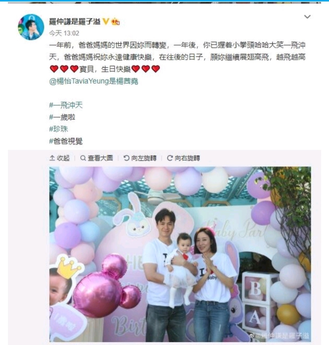 藝人楊茜堯(前名楊怡)與羅子溢(前名羅仲謙)2016年結婚,去年誕下愛女羅翊心(小珍珠),不覺間小珍珠已經一歲了。兩人今日(16日)在微博上載和女兒搞了生日派對的温馨照片。