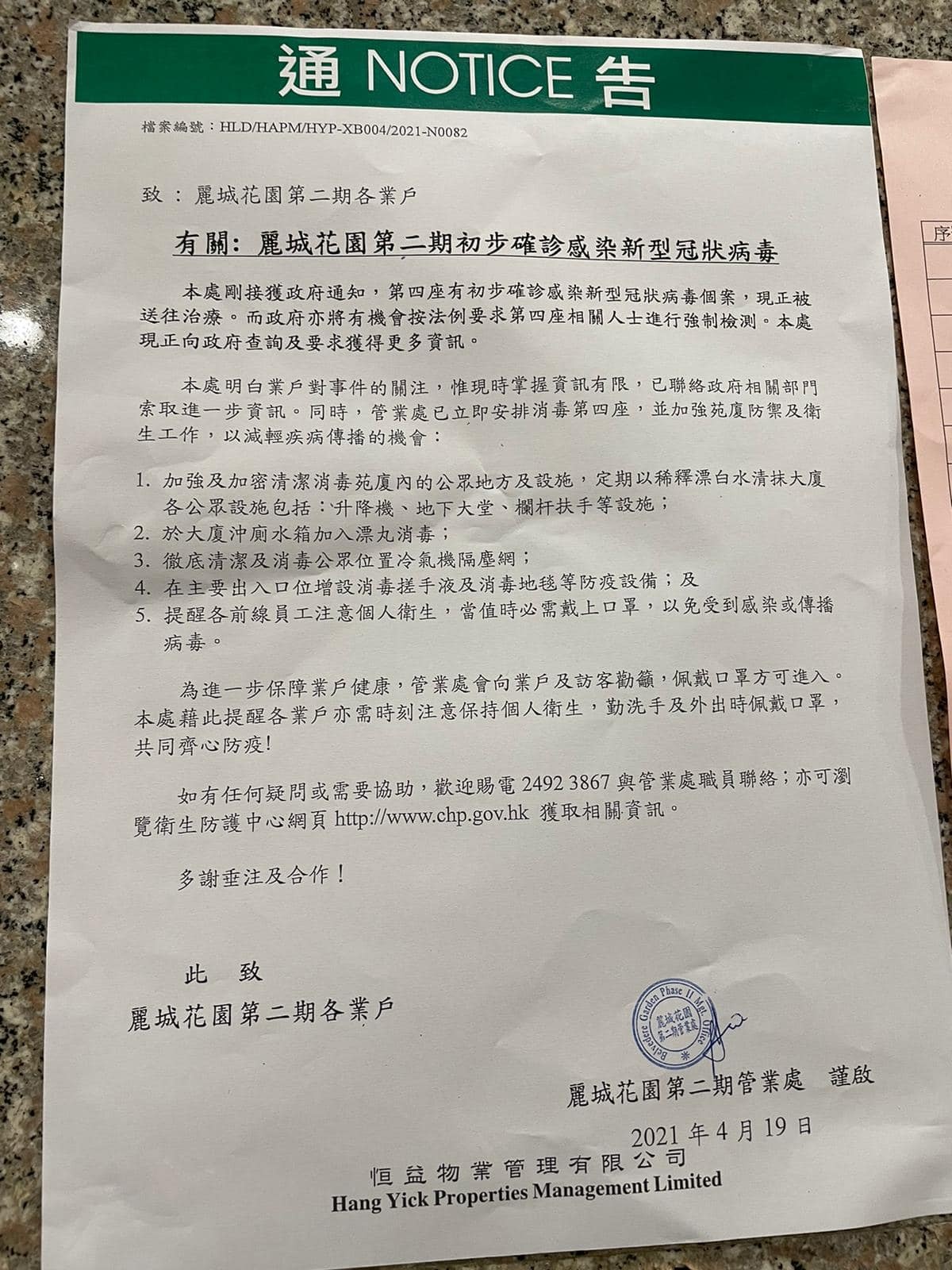 有荃灣區議員在社交平台貼上一張大廈管業處今日發出的通告,指麗城花園第二期4座有人初步確診,正送院治療。管業處明白業戶對事件的關注,惟現時掌握資訊有限,已聯絡政府相關部門索取進一步資訊,已立即安排消毒第4座,並加強苑廈防禦及衞生工作,以減輕疾病傳播的機會。