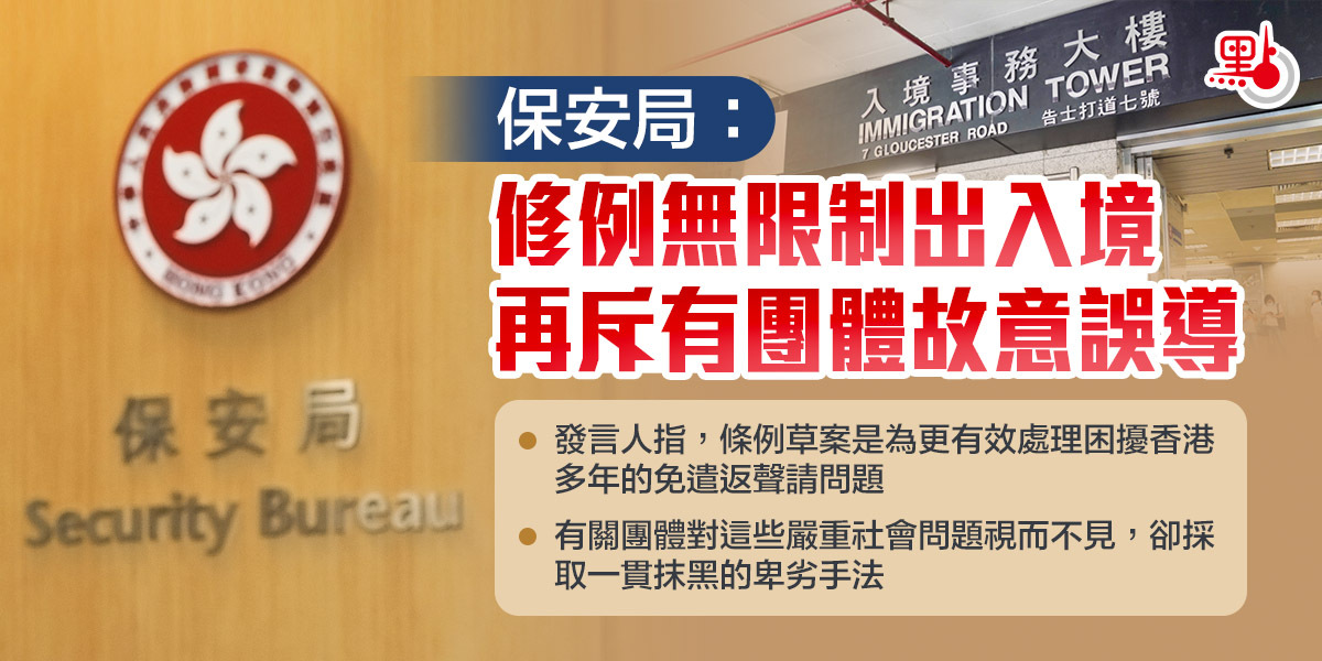 保安局發言人指出,有團體近日對條例草案下賦權保安局局長就運輸工具提供乘客資料訂立規例的條文,故意曲解為限制香港居民的出入境自由,透過情緒化和敵對的言辭,嘗試散播謠言,蠱惑人心,製造社會矛盾。發言人指,條例草案是為更有效處理困擾香港多年的免遣返聲請問題。事實上,現時仍然有超過1.3萬名聲請人逗留在港。在已完成審核的聲請中,99%的個案都不獲確立。政府每年花費大量公帑,近年平均每年約10億元。這些人當中除有「打黑工」外,更有涉嫌搶劫、販毒和傷人等罪行的,社會及立法會都擔心帶來的治安問題。最令人憤慨的是,有關團體對這些嚴重社會問題視而不見,對政府過去屢次悉心解釋聽而不聞,卻採取一貫抹黑的卑劣手法,別有用心攻擊政府解決這困擾香港多年的棘手問題的努力。