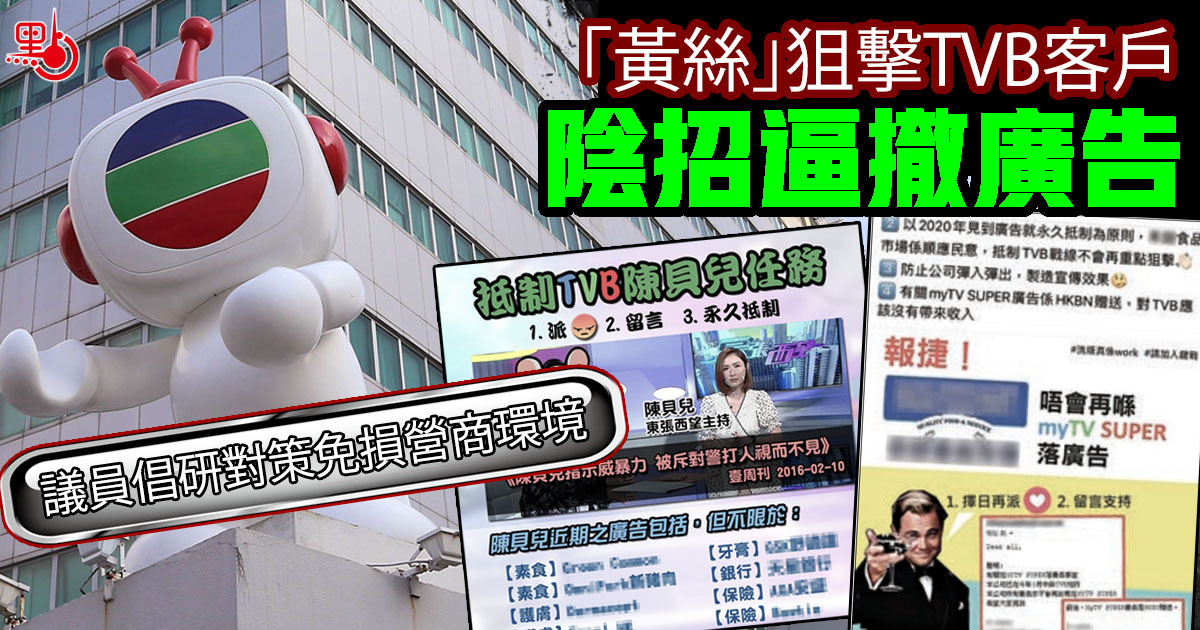 「黃絲」自前年黑暴爆發至今,仍不斷抹黑電視廣播有限公司(TVB),廣告商戶更長期遭無理滋擾。據了解,有原本在TVB投放逾千萬元廣告的大客戶,因被瘋狂狙擊而撤廣告,嚴重損害TVB廣告收益。去年國安法實施後, 「黃絲」狙擊手法更從「線下」轉到「線上」,在不同社交平台發布廣告商名單,呼籲網民「派嬲」兼杯葛,又慫慂轉幫襯「黃店」。