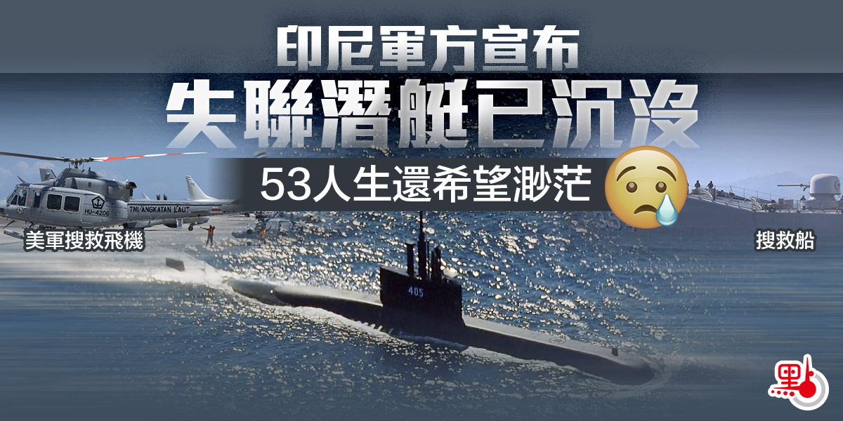 印度尼西亞當地時間21日,一艘載有53人的潛艇在巴厘島以北海域演習時失聯。印尼軍方今日(24日)表示,搜救人員已發現失聯潛艇的殘骸和潛艇內多件物品,正式宣布潛艇「沉沒」。這意味着潛艇上載有的53人生還希望渺茫。