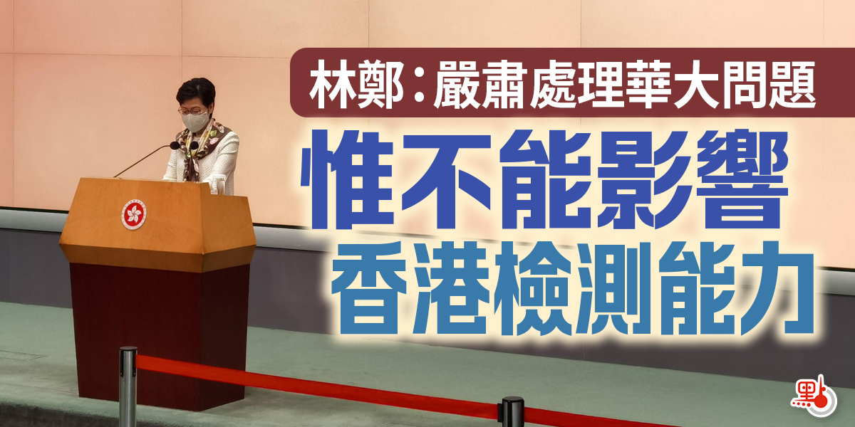 林鄭月娥說,過去15個月的情況表明,檢測對抗疫非常重要,經過各方努力,香港檢測能力從去年1月的每日數千到現在輕鬆10萬,其中華大基因是重要的合作夥伴。她指出,近日華大基因在檢測中出現錯誤,檢測結果如果是「假陽性」「假陰性」,會給市民帶來很多困擾,會被無辜送醫院。政府抗疫顧問袁國勇此前已經去實地考察,發現了一些問題,政府會嚴肅處理相關問題。