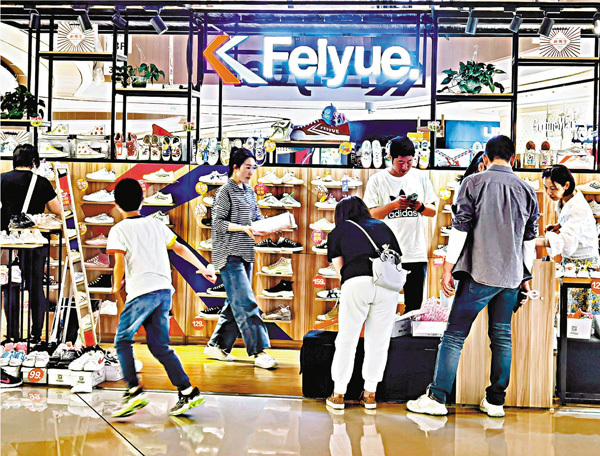 位於七寶的飛躍專賣店,這處不大的店面坐滿了顧客,都是為旅遊來挑鞋。香港文匯報記者想要試穿一雙鞋竟然找不到座位。除了傳統的小白鞋、帆布鞋,還有不少聯名款,如一款聯名「招財貓」的鞋子,配上可愛飾品與萌款鞋帶,則是近期銷售最為火爆的款式,「這段時間賣得太好了,都忙不過來。」店員表示。