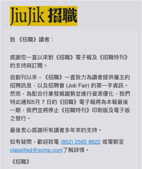 南華早報旗下招聘雜誌《招職》今日(7日)發電郵予訂閱讀者,稱為配合行業發展趨勢並進行資源優化,將停止發行《招職特刊》印刷版及電子版,5月7日的《招職》電子報將為最後一期。