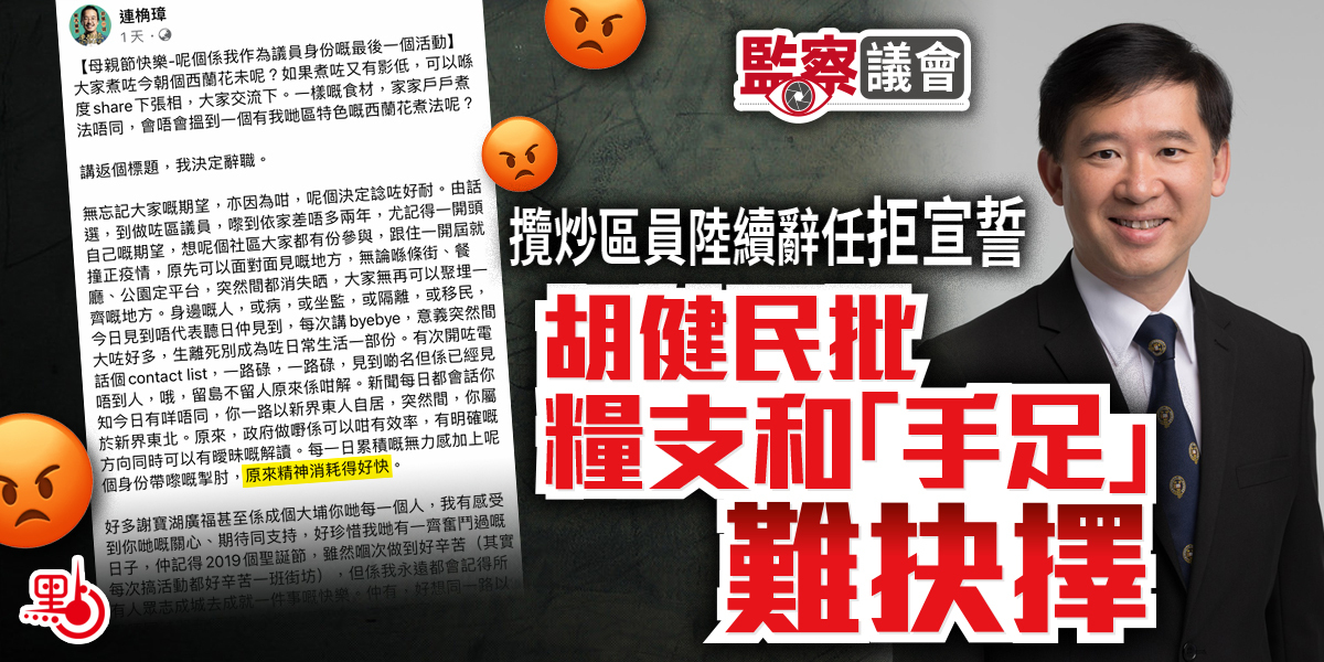 攬炒派大埔區議員連桷璋亦於星期日(9日)發文宣布辭職,稱「原來精神消耗得好快」。胡健民指,區議員作為政府諮詢架構內的一個成員,亦是政府同居民之間的橋樑,要為居民提供各種資訊和幫助。批評部分攬炒派區議員一心只想藉區議會宣揚政治理念,將服務街坊視作工作繁重。