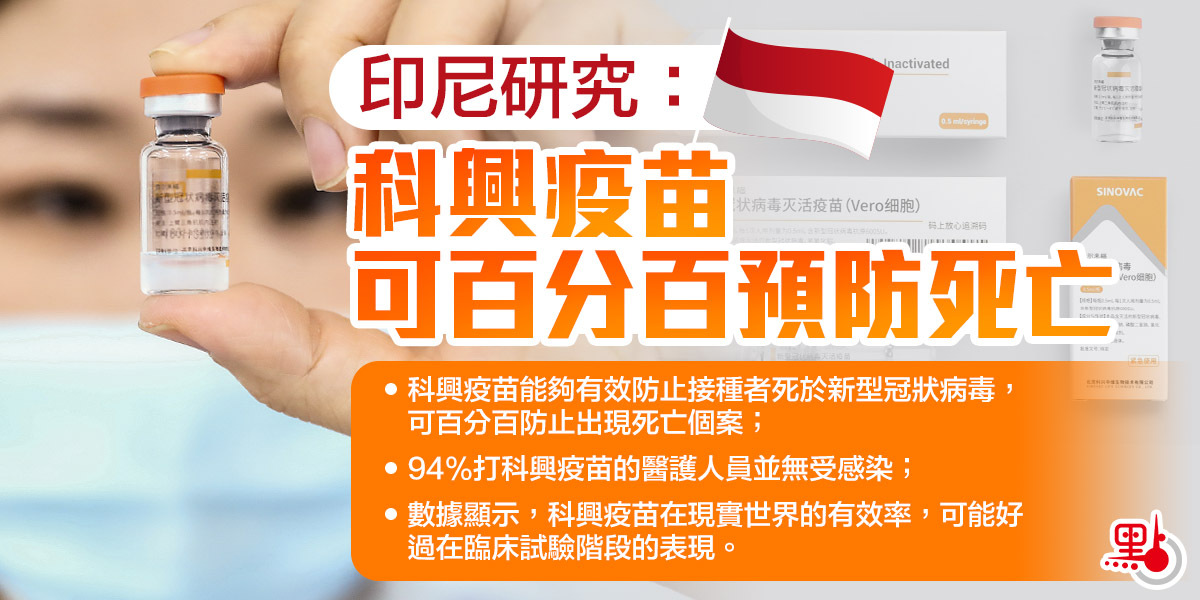 印尼近期一項研究顯示,中國科興疫苗能夠有效防止接種者死於新型冠狀病毒和住院。雅加達逾2.5萬名醫護人員早前接種完兩劑科興疫苗,研究顯示完成接種7天後,已經可百分百防止出現死亡個案,預防住院的成效亦達到96%。