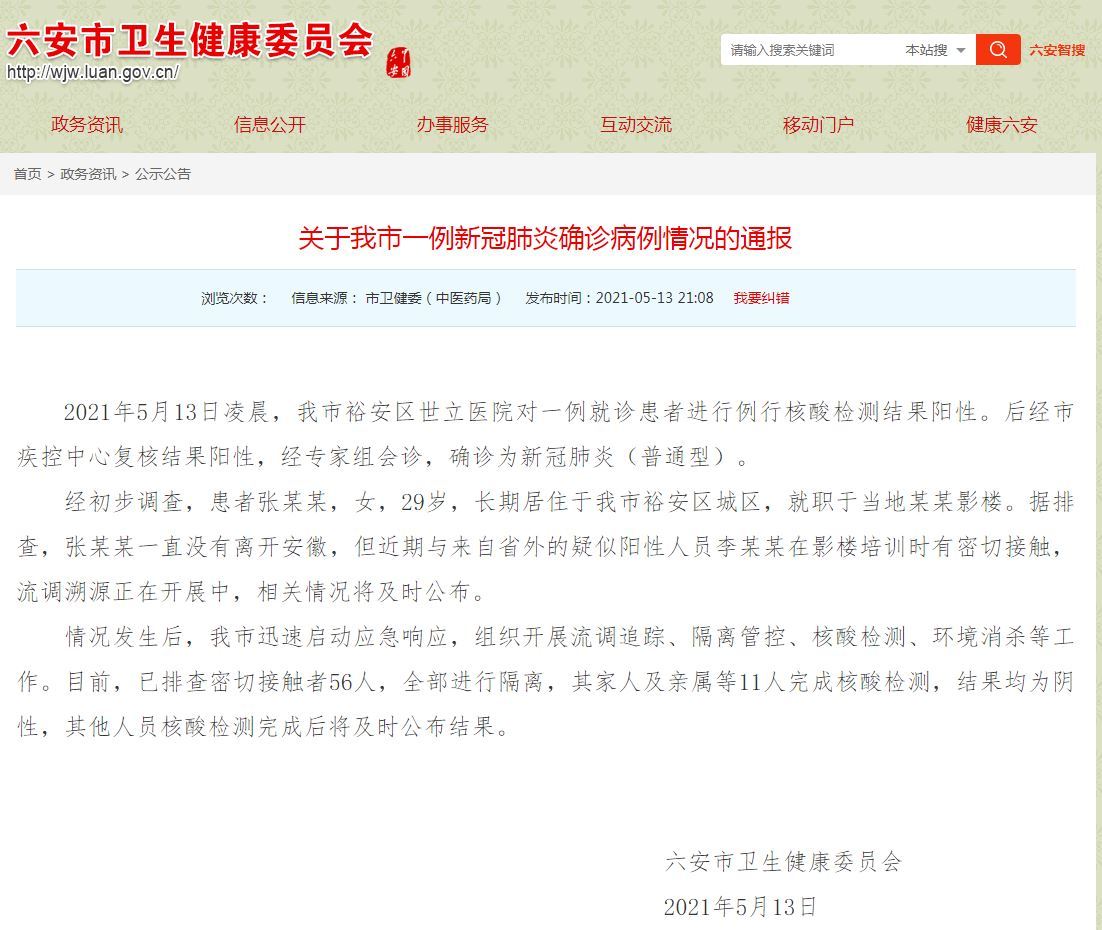 據安徽省六安市衞健委網站消息,今日(13日)凌晨,六安市裕安區世立醫院對一例就診患者進行例行核酸檢測結果陽性。後經市疾控中心覆核結果陽性,經專家組會診,確診為新冠肺炎。