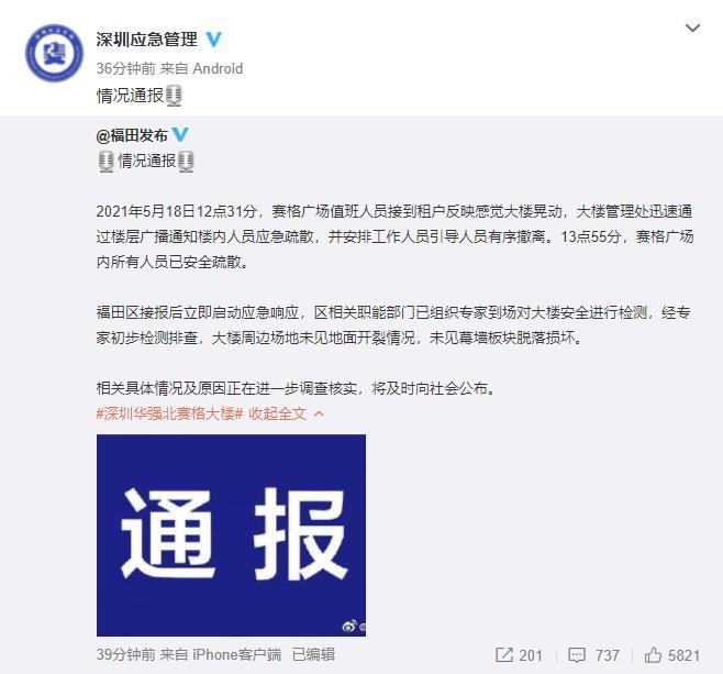 福田區接報後立即啟動應急響應,區相關職能部門已組織專家到場對大樓安全進行檢測,經專家初步檢測排查,大樓周邊場地未見地面開裂情況,未見幕牆板塊脫落損壞。相關具體情況及原因正在進一步調查核實,將及時向社會公布。