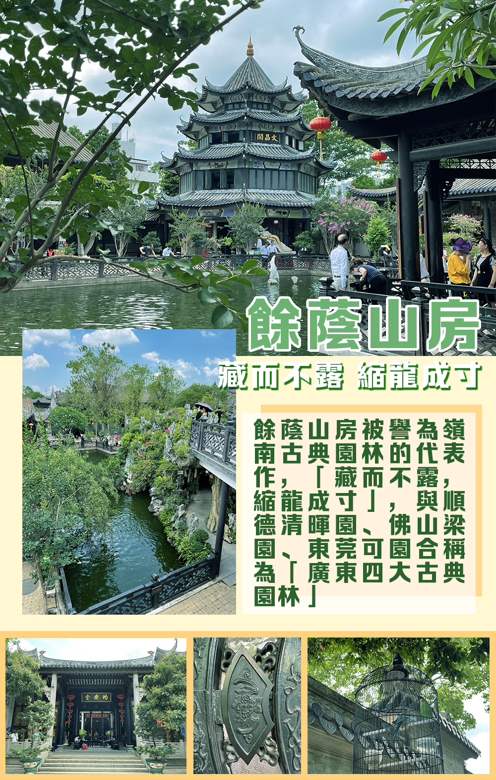 餘蔭山房被譽為嶺南古典園林的代表作,「藏而不露,縮龍成寸」,與順德清暉園、佛山梁園、東莞可園合稱為廣東四大古典園林。而比起清暉園,餘蔭山房錯落中始終保持着一種規整和氣魄,不僅有移步換景之妙處,亦有空間的縱深感,俯仰之間,瞬息百變。